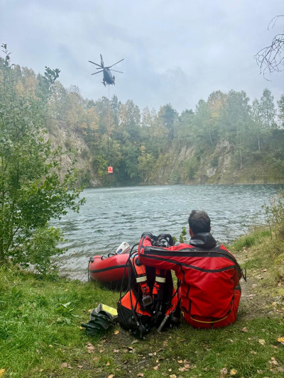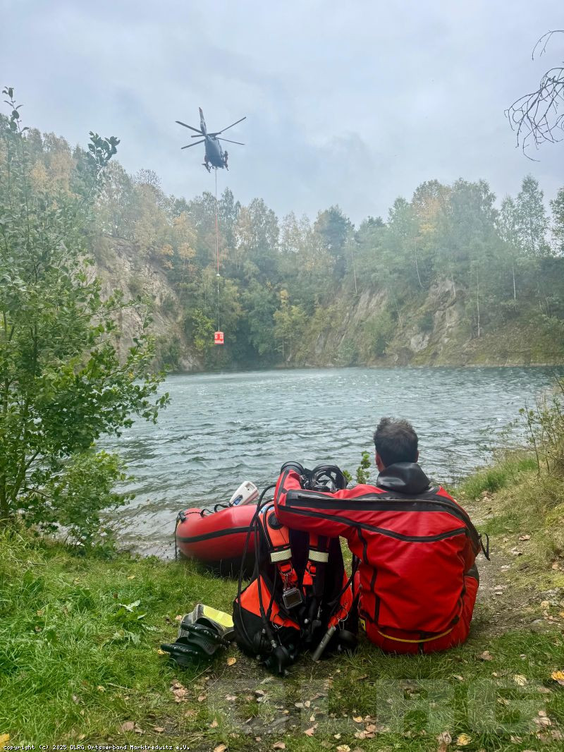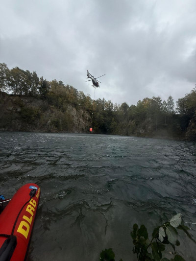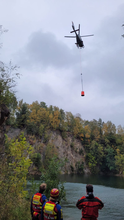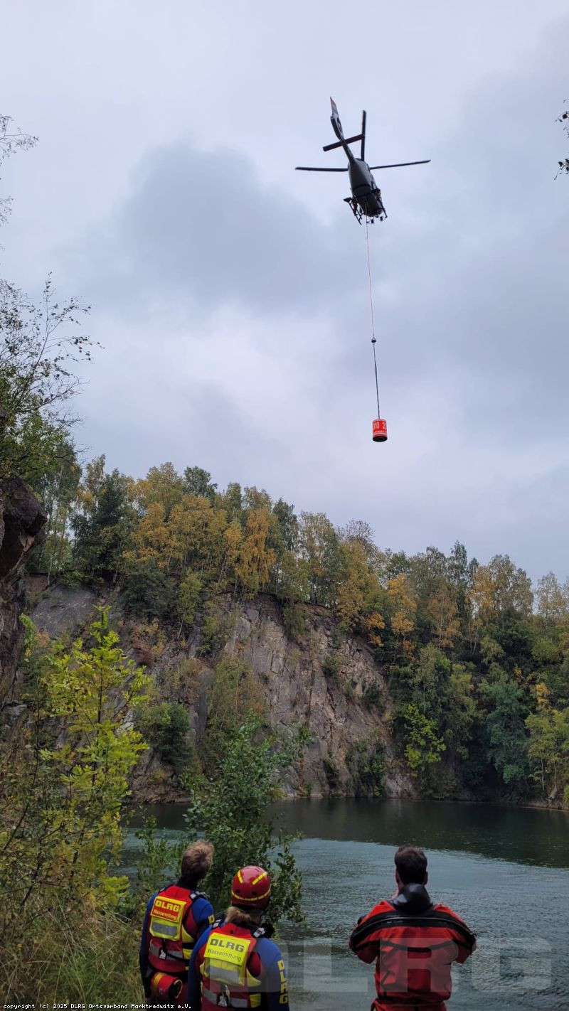 Absicherung der Hubschrauber-Wasserentnahme aus einem Steinbruch durch Tauchtrupp.